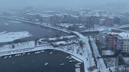 İstanbul’daki kar yağışı Silivri’yi beyaza bürüdü; öğle saatlerinde sahil şeridinde evlerin çatıları ve bağlı tekneler karla kaplandı, görüntülendi.