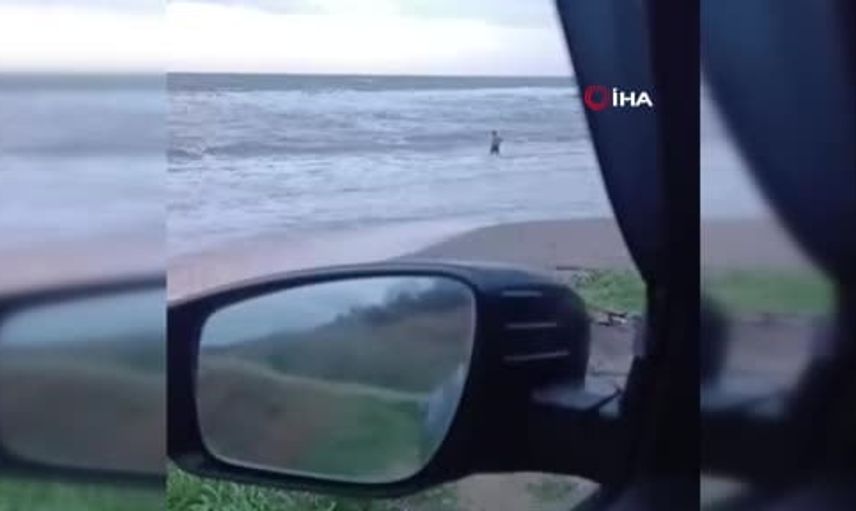 Görüntülerde dalgaların şiddetli olduğu, vatandaşın rüzgar ve dalgalara aldırış etmeden denize girip yüzdüğü ve canını tehlikeye attığı anlar yer aldı. İzleyenler, kişinin kısa süre sonra sağ salim kıyıya ulaştığını gördü.