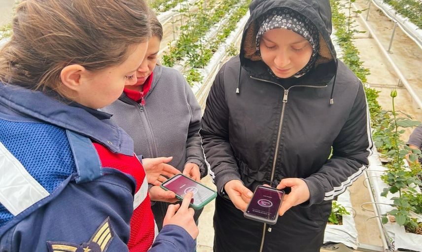 Kütahya İl Jandarma Komutanlığı Aile İçi Şiddetle Mücadele Çocuk Kısım Amirliği ile Simav İlçe Jandarma Komutanlığı ekipleri, Simav ilçesi Çitgöl Beldesi'ndeki çiçek serasında çalışan 54 kadına Kadın Acil Destek Uygulaması (KADES) hakkında bilgilendirme yaptı.