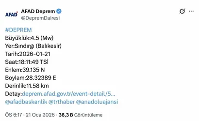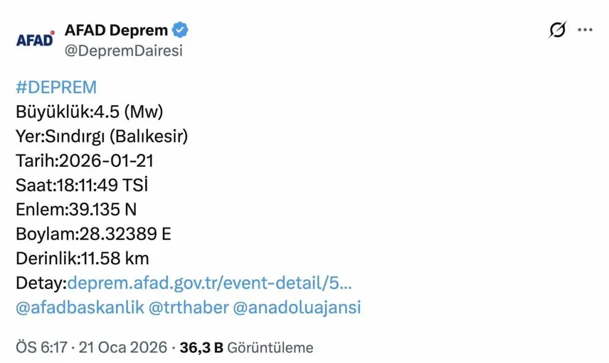 AFAD'dan alınan bilgilere göre, saat 18.11'de, merkez üssü Balıkesir'in Sındırgı ilçesi olan 4.5 büyüklüğünde deprem meydana geldi.