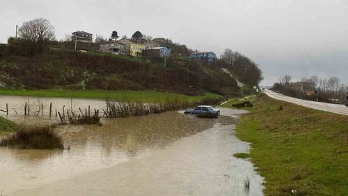 Sinop-Ayancık yolunda su birikintisine giren otomobil şarampole saplandı