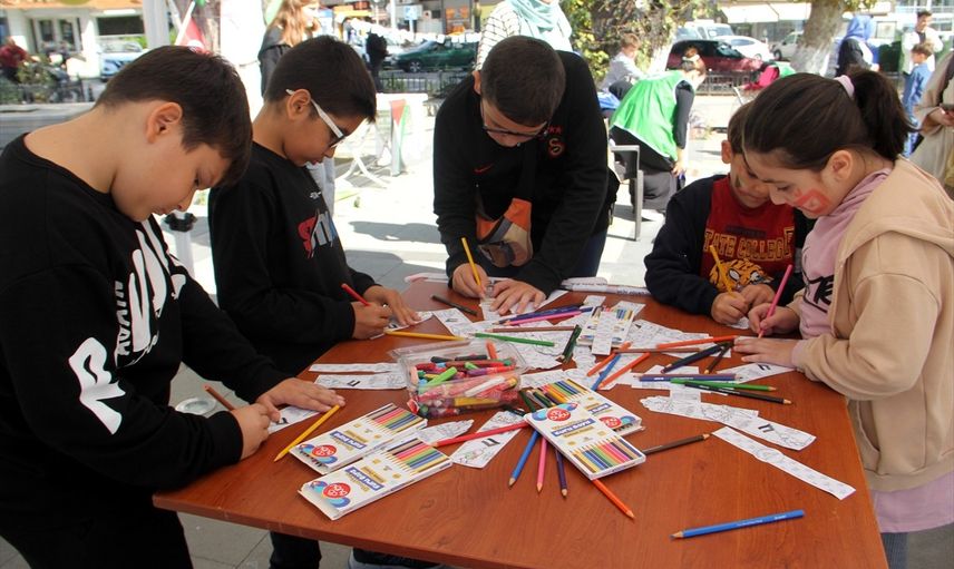 Sinop'ta Uğur Mumcu Meydanı yakınında düzenlenen etkinlikte Yetim Vakfı ve İHH öncülüğünde bir araya gelen onlarca çocuk, İsrail'in Gazze'deki zulmünü kınayan resimler çizdi. Etkinlik, çocukların duygularını ve dayanışma mesajlarını sanat yoluyla iletmelerine olanak sağladı.