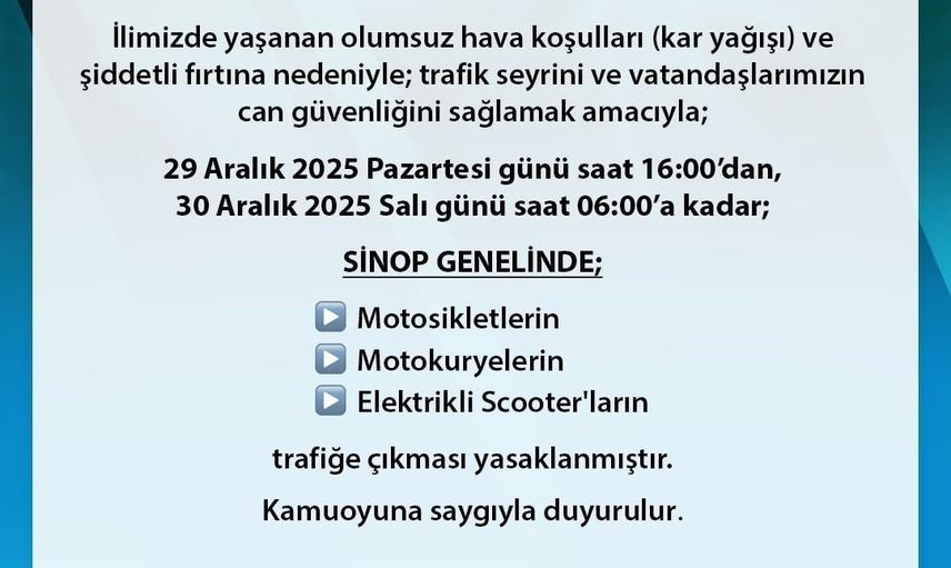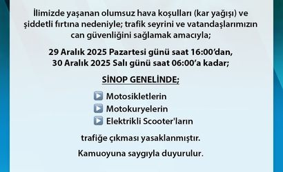 Valilik tarafından yapılan açıklamada şu ifadelere yer verildi: "İlimizde yaşanan olumsuz hava koşulları ve şiddetli fırtına nedeniyle, trafik seyrini ve vatandaşlarımızın can güvenliğini sağlamak amacıyla; 29 Aralık 2025 Pazartesi günü saat 16.00’dan itibaren 30 Aralık Salı 06.00 saatine kadar, Sinop genelinde motosikletlerin, motokuryelerin, elektrikli scooterların, tedbiren trafiğe çıkışı yasaklanmıştır".