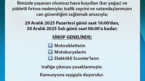 Sinop Valiliği, şiddetli fırtına nedeniyle 29 Aralık 2025 16:00'dan 30 Aralık 06:00'ya kadar motosiklet, motokurye ve elektrikli scooterların trafikte seyretmesini yasakladı.