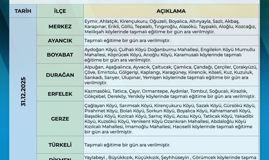 Açıklamaya göre, Türkeli ve Ayancık ilçelerinde taşımalı eğitim bir gün süreyle ara verildi. Ayrıca Merkez ilçe ile Boyabat, Erfelek, Durağan, Gerze ve Dikmen ilçelerinin bazı bölgelerinde taşımalı eğitime kısmi ara uygulanacak.