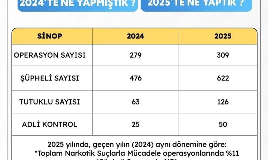 Paylaşılan verilere göre Sinop genelinde 2024 yılında narkotik suçlarla mücadele kapsamında 279 operasyon gerçekleştirilirken, bu sayı 2025 yılında 309a yükseldi. Şüpheli sayısı 2024’te 476 iken, 2025’te 622 olarak kaydedildi. Tutuklu sayısı 63’ten 126’ya, adli kontrol uygulanan kişi sayısı ise 25’ten 50’ye yükseldi.