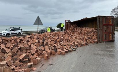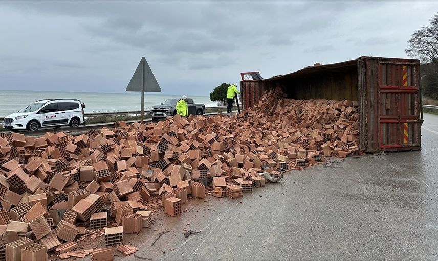 Kaza sonrası yola dökülen tuğlalar, karayolları ekipleri tarafından kaldırılarak yolun trafiğe açılması sağlandı.