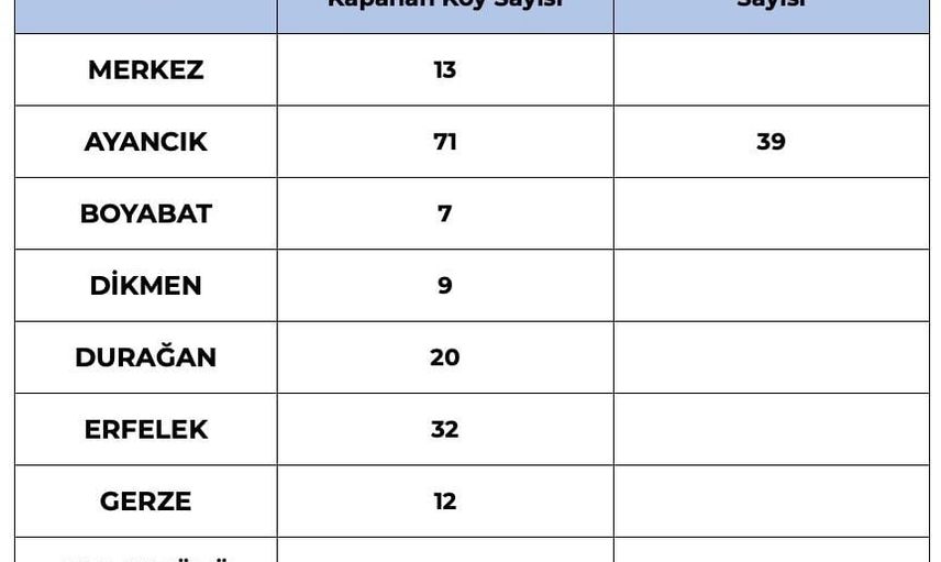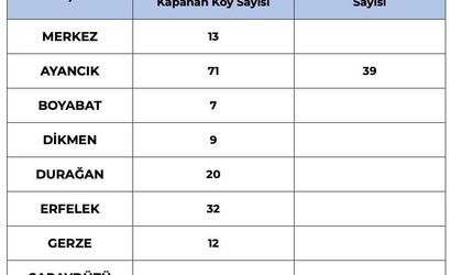 İlçelere göre kapalı köy yolu sayıları şu şekilde kaydedildi: Merkez 13, Ayancık 71, Boyabat 7, Dikmen 9, Durağan 20, Erfelek 32, Gerze 12 ve Türkeli 32.