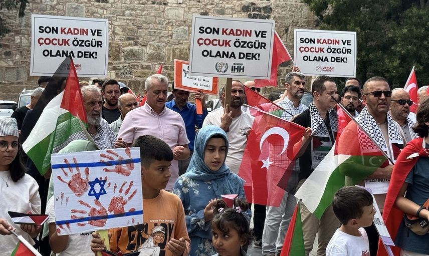 Sinop'ta 'Filistin'e Destek Platformu'nun çağrısıyla Uğur Mumcu Meydanı'nda toplanan vatandaşlar, Sumud için kararlılıkla yürüyoruz yazılı pankartlar açarak İsrail'i kınayan sloganlar attı.