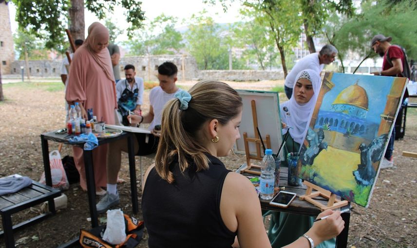 Novi Pazar'daki En Nisa Derneği ve İHH İnsani Yardım Vakfı işbirliğiyle gerçekleştirilen etkinlikte, 20 ressam 3 gün boyunca Filistin'e yönelik İsrail saldırılarını tuvallerine yansıtmayı amaçlıyor.