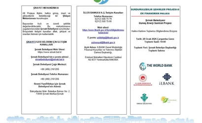 Şırnak Belediyesi, proje sürecinde şeffaf ve katılımcı bir yaklaşım benimseyerek vatandaşların görüşlerini alacak. Bu kapsamda GES projesine ilişkin halkın katılımı toplantısı 28 Ocak 2026 Çarşamba günü saat 14.00'te Şırnak Belediye Başkanlığı toplantı salonu'nda düzenlenecek.