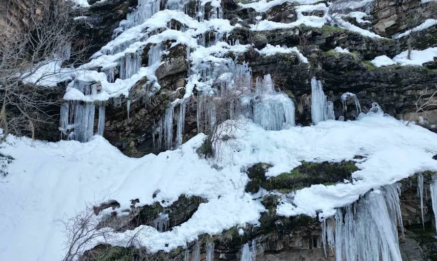 Dron görüntüleri, kar örtüsünün vadiler ve su yolları üzerindeki etkisini belirginleştiriyor; beyazın coğrafi hatları vurgulaması, bölgenin mevsimsel dönüşümünü ve manzara estetiğini ön plana çıkarıyor.