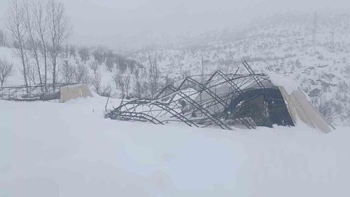 Beytüşşebap'ta yoğun kar, ilçedeki tek kapalı halı sahanın Ali Çavuş Mahallesi'ndeki demirlerinin çökmesine neden oldu; saha 3 yıl önce yapılmış.