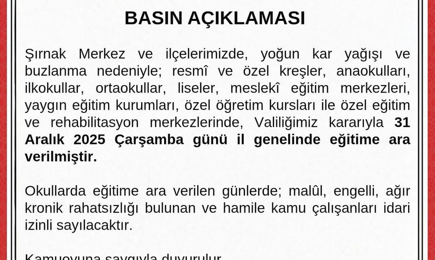 Açıklamada, resmi ve özel kreşler, anaokulları, ilkokullar, ortaokullar, liseler, meslekî eğitim merkezleri, yaygın eğitim kurumları, özel öğretim kursları ile özel eğitim ve rehabilitasyon merkezlerinin, valiliğin kararıyla 31 Aralık 2025 Çarşamba günü il genelinde eğitime ara verildiği duyuruldu.