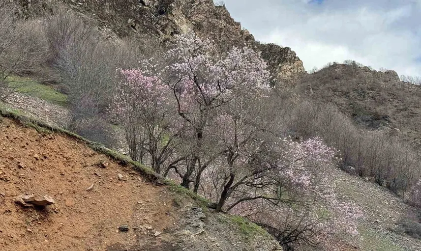 Şırnak'ta havaların ısınmasıyla dağlardaki badem ağaçları çiçek açmaya başladı. Açan çiçekler, bölgede oluşan renk cümbüşüyle ziyaretçilere görsel bir şölen sunuyor.