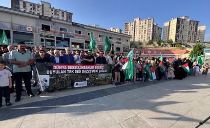 Şırnak'ta, İsrail'in Gazze'ye yönelik saldırıları protesto edildi. Peygamber Sevdalıları Vakfı Şırnak Şubesi öncülüğünde düzenlenen eylemde, Cumhuriyet Meydanı’nda bir araya gelen sivil toplum kuruluşları temsilcileri ve üyeleri, ellerinde Filistin bayrakları tutarak tekbir getirdi ve İsrail karşıtı sloganlar attı.