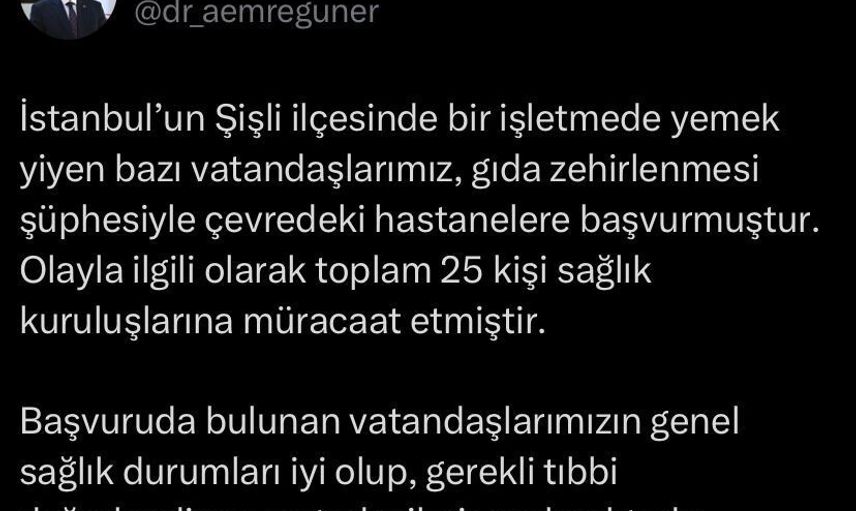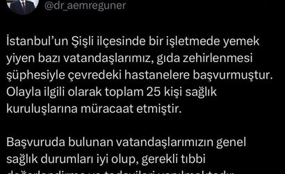 Güner, olaya ilişkin yaptığı yazılı açıklamada şunları belirtti: "İstanbul’un Şişli ilçesinde bir işletmede yemek yiyen bazı vatandaşlarımız, gıda zehirlenmesi şüphesiyle çevredeki hastanelere başvurmuştur. Olayla ilgili olarak toplam 25 kişi sağlık kuruluşlarına müracaat etmiştir. Başvuruda bulunan vatandaşlarımızın genel sağlık durumları iyi olup, gerekli tıbbi değerlendirme ve tedavileri yapılmaktadır."