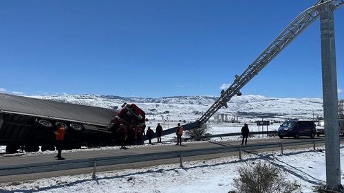 Sivas'ın Gölova ilçesinde bir tır, EDS direğine çarpıp bariyerlerde asılı kaldı. Sürücü AFAD ekipleri tarafından kurtarıldı.