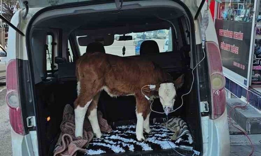 Rahatsızlanan hayvan, besici tarafından ilçe merkezindeki veterinere götürüldü. Veteriner hekim Bülent Köse, buzağıya otomobilin bagajında acil müdahale yaptı.