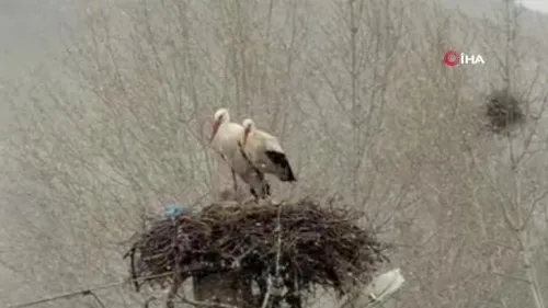 Mart ayında Anadolu'ya dönen leylekler Sivas'ta, sıcaklığın -4°C'ye düşmesiyle kar yağışıyla karşılaştı; anlar cep telefonuyla kaydedildi.