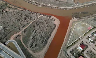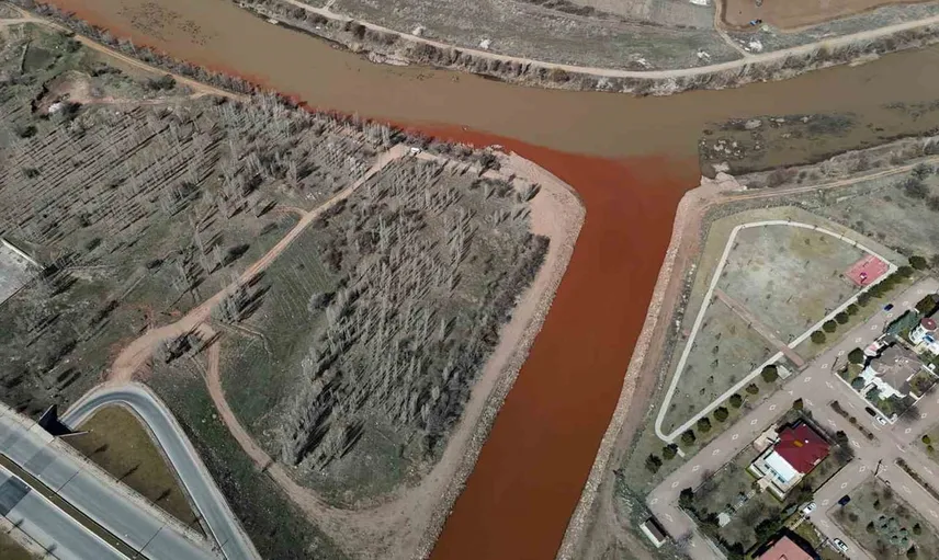 Sivas’ta baharın gelişiyle birlikte eriyen kar suları sonucu Fadlum Çayı kızıl renge büründü. Çayın taşıdığı kızıl suyun Kızılırmak ile birleştiği anlar havadan görüntülendi.
