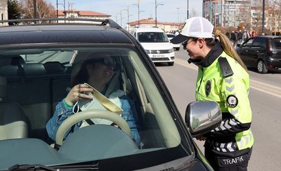 Sivas'ta trafik ekipleri, 8 Mart Dünya Kadınlar Günü dolayısıyla uygulama noktasında durdurdukları kadın sürücülere hediye verdi.