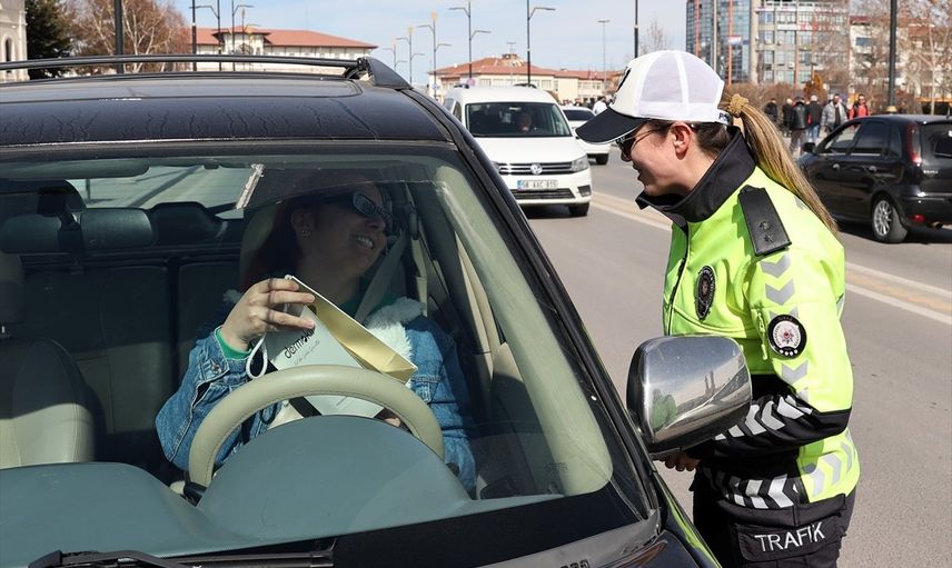 Sivas'ta, 8 Mart Dünya Kadınlar Günü dolayısıyla trafik ekipleri, uygulama noktasında durdurdukları kadın sürücülere hediye verdi.