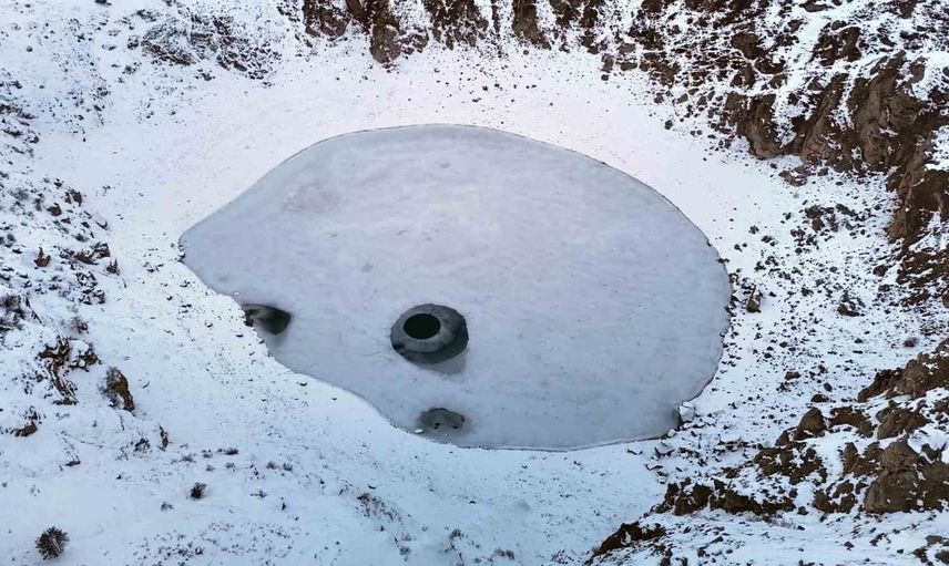 Sivas'ın Zara ilçesi yakınlarındaki Kızılçan Gölü, son günlerde etkili olan soğuk hava nedeniyle dondu. Kentin en büyük krater göllerinden biri olan gölde oluşan buz tabakası ve çevresindeki kar örtüsü, havadan görüntülendi ve kartpostallık görüntüler ortaya çıktı.