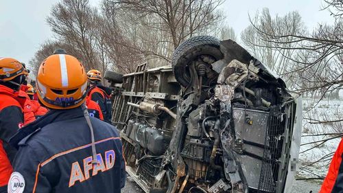 Sivas'ta Alahacı yakınlarında buzlanma nedeniyle yan yatan okul servisinde 14 öğrenci ile sürücü yaralandı; 2 öğrenci orta, diğerleri hafif yaralı.