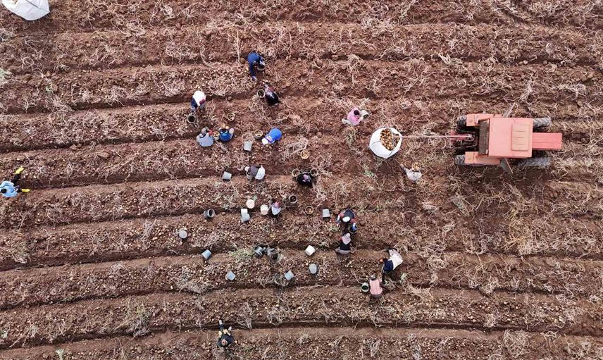 Patates sökümü yerel iş gücü ile sürerken, operasyonların izlenmesi ve alan dağılımının değerlendirilmesi amacıyla dron ile havadan görüntüleme yapıldı. Bu görüntüler, hasat yoğunluğunu ve işlemlerin sahadaki seyrini göstermesi açısından önemli bir kaynak sağlıyor.