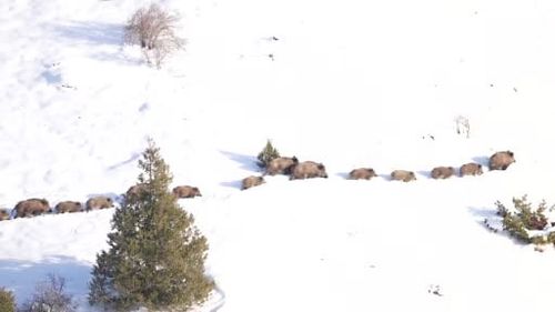 Sivas'ta doğa fotoğrafçısı Mustafa Aslan, yaklaşık 40 domuzun sıfırın altında 20°C'de barajı tek sıra halinde yüzerek geçtiği anları görüntüledi.