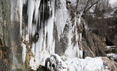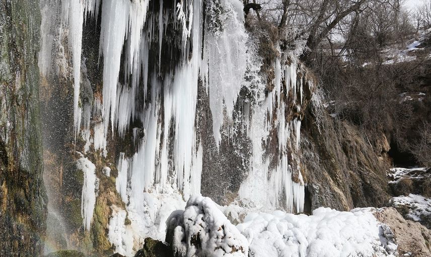 Sivas'ın Gemerek ilçesindeki soğuk hava nedeniyle buz tutan Sızır Şelalesi'nde 3-4 metrelik sarkıtlar oluştu.