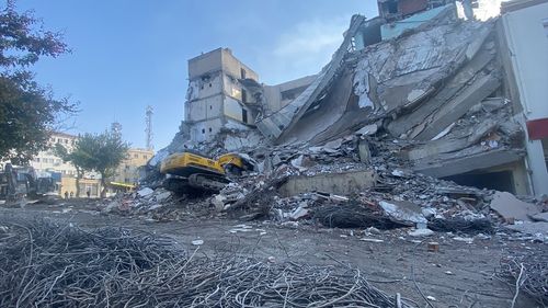 Şanlıurfa'nın Siverek ilçesinde, depremde hasar gören bir bina yıkım sırasında çöktü, iş makinesi hasar gördü.