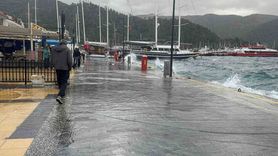 Marmaris’te kuvvetli lodos sahil işletmelerine deniz suyu taşıdı