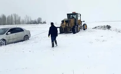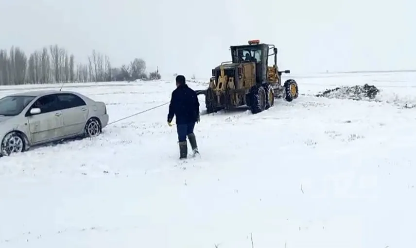 Yozgat’ın Sorgun ilçesinde etkili olan kar yağışı nedeniyle bir araç, Aşağıcumafakılı köy yolunda ilerlemekte güçlük çekerek yolda mahsur kaldı.