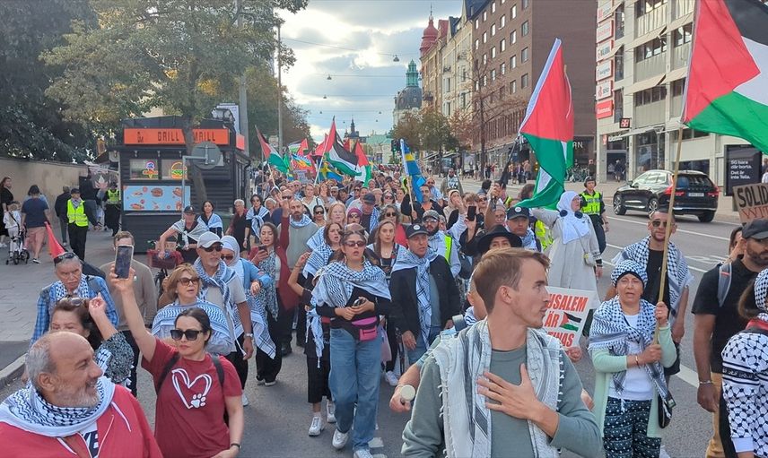 Çeşitli sivil toplum kuruluşlarının önderliğinde Odenplan bölgesinde bir araya gelen kalabalık, İsrail'in Gazze'deki "savaş suçlarını" durdurmasını talep etti.