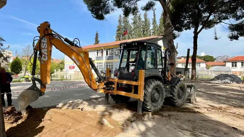 Başkan Osman Yıldırımkaya, Atça Atatürk İlkokulu’ndaki parke taşı çalışmalarını inceledi; en büyük motivasyonlarının çocukların içten gülüşleri olduğunu söyledi.
