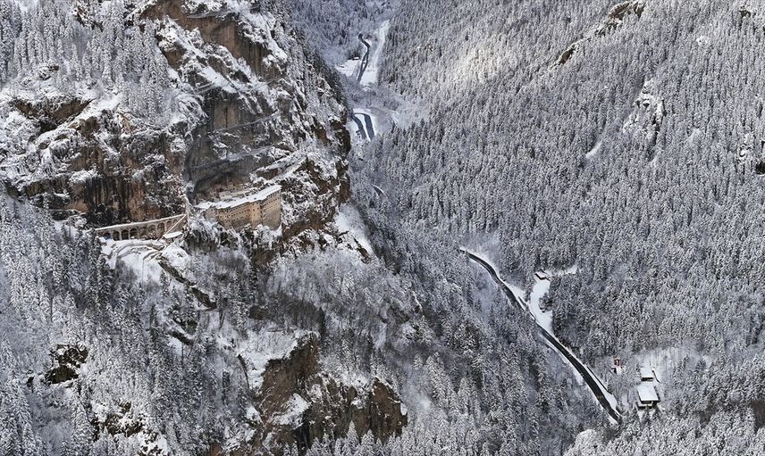 Trabzon'un Maçka ilçesinde bulunan tarihi Sümela Manastırı, son günlerde etkili olan kar yağışı sonrasında görsel bir şölen sunuyor. Karadağ'ın Altındere Vadisi'ne bakan, yaklaşık 300 metre yükseklikteki ormanlık alanda yer alan Sümela Manastırı, kayalar oyularak inşa edilmiştir ve halk arasında 'Meryem Ana' olarak da bilinmektedir.