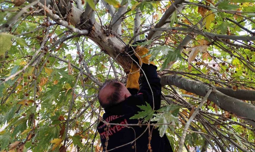 Çorum'un Sungurlu ilçesinde tırmandığı ağaçta mahsur kalan bir kedi, itfaiye ekiplerinin müdahalesiyle kurtarıldı.