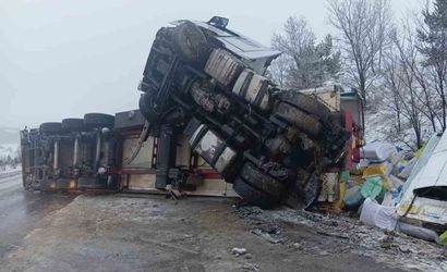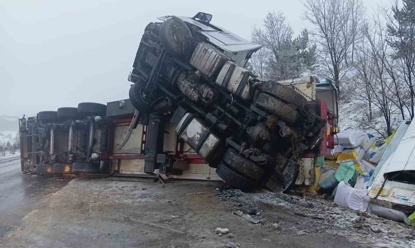 Sungurlu'da buzlanma nedeniyle tır devrildi: Sürücü yaralandı