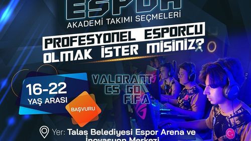 Talas Belediyesi, 16-22 yaş arası oyuncular için Valorant, CS GO ve FIFA branşlarında Espor Akademi Takımı seçmeleri düzenliyor; başvuru online formla yapılır.