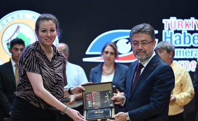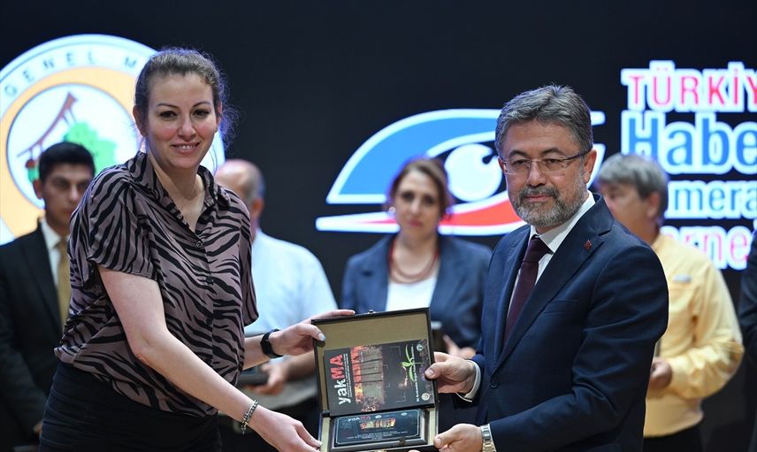 Tarım ve Orman Bakanı İbrahim Yumaklı, Türkiye Haber Kameramanları Derneği tarafından düzenlenen, habercilerin ve orman çalışanlarının kaleminden Türkiye'deki orman yangınlarını anlatan "yakMA" kitabı yazarlarına teşekkür plaket töreni ve kitap tanıtımına katıldı. Anadolu Ajansı (AA) Karadeniz Haberleri Müdür Yardımcısı Ayşe Eda Ünlü Özen (solda), Tarım ve Orman Bakanı İbrahim Yumaklı'dan (sağda) ödül aldı.