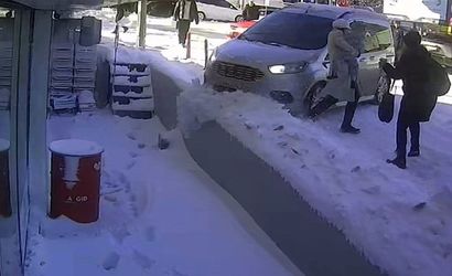 Buzlanma sonucu kayan araç, yolda çocukla birlikte yürüyen iki kadına doğru savruldu. Kadınlar ve kucağındaki bebek, araç altında kalmaktan son anda kurtarıldı. Araç yol kenarına çıkarak binanın bodrum katında bulunan iş yerlerine girmek üzereyken askıda kaldı.