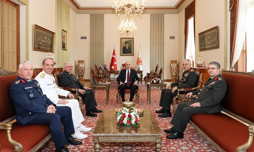 Türkiye Büyük Millet Meclisi (TBMM) Başkanı Numan Kurtulmuş (sağ 3), Milli Savunma Bakanı Yaşar Güler (sol 3) ve beraberindeki Genelkurmay Başkanı Orgeneral Metin Gürak (sağ 2), Kara Kuvvetleri Komutanı Orgeneral Selçuk Bayraktaroğlu (sağda), Deniz Kuvvetleri Komutanı Oramiral Ercüment Tatlıoğlu (sol 2) ve Hava Kuvvetleri Komutanı Orgeneral Ziya Cemal Kadıoğlu'nu (solda) Meclis'te kabul etti.