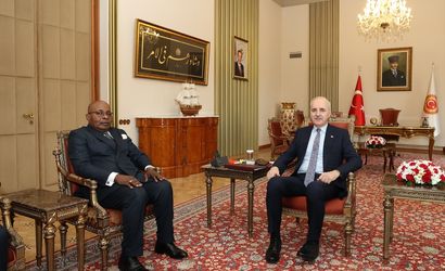 TBMM Başkanı Numan Kurtulmuş (sağda), Ekvator Ginesi Büyükelçisi Jose Esono Micha Akeng'i (solda) kabul etti.