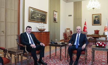 TBMM Başkanı Numan Kurtulmuş (sağda), Sırbistan'ın Ankara Büyükelçisi Aca Jovanovic’i (solda) Mecliste kabul etti.