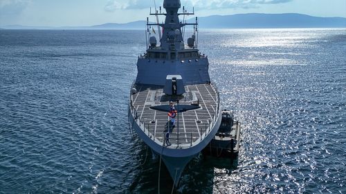 Japonya seyrinin ardından TCG Kınalıada korveti Foça'da duygusal bir törenle karşılandı. Personel aileleriyle buluştu.