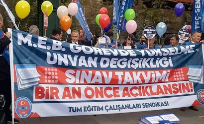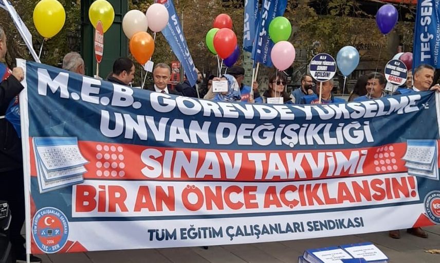 Tüm Eğitim Çalışanları Sendikası (TEÇ-SEN) ile Devlet Memurları Konfederasyonu (DMK) üyeleri, görevde yükselme ve unvan değişikliği sınavlarında planlama hataları olduğunu ileri sürerek Milli Eğitim Bakanlığı önünde toplandı. Sendika temsilcileri, mevcut sistemin eğitim çalışanlarının kariyer planlamasında belirsizlik yarattığını belirtti ve bu konudaki talepleri iletmek üzere çok sayıda eğitimciden toplanmış dilekçeleri bakanlığa sunacaklarını açıkladı.