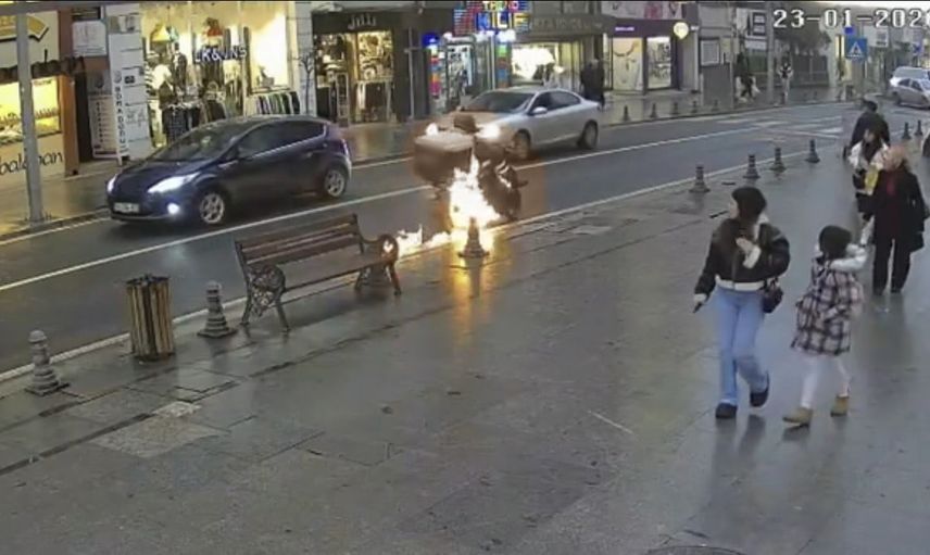 Tekirdağ Çorlu Kemalettin Mahallesi Salih Omurtak Caddesi üzeri Çeşme Durağı yakınlarında seyir halinde olan bir motosikletin aniden alev aldığı anlar kayda geçti. Belediye yönüne doğru ilerleyen motosikletin alev aldığı sırada sürücü aracın üzerinden hızla atlayarak yanmaktan saniyelerle kurtuldu.