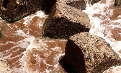 Tekirdağ'da 4 gündür etkili olan poyraz nedeniyle sahilin bazı bölümleri kırmızı yosunla kaplandı.